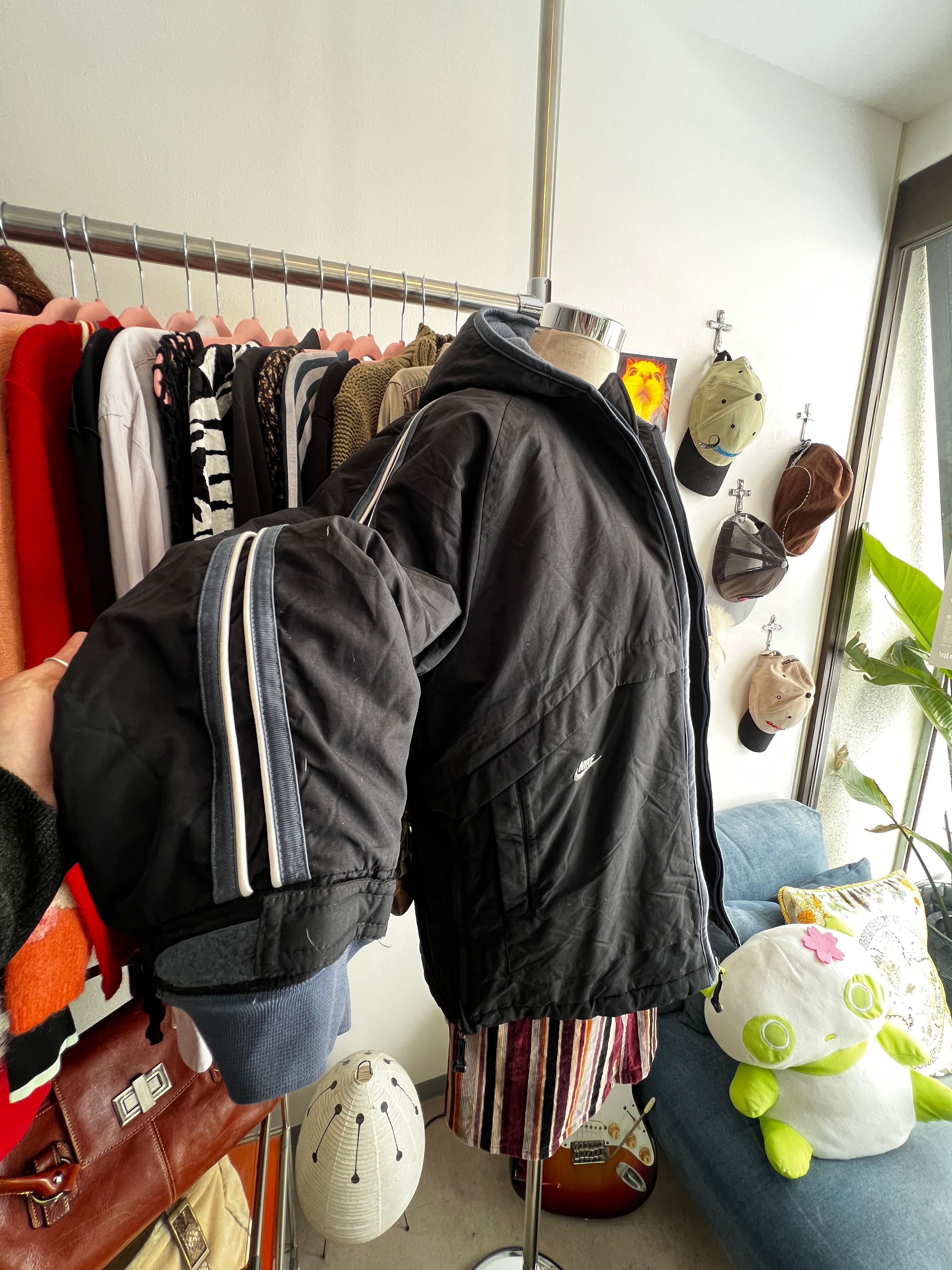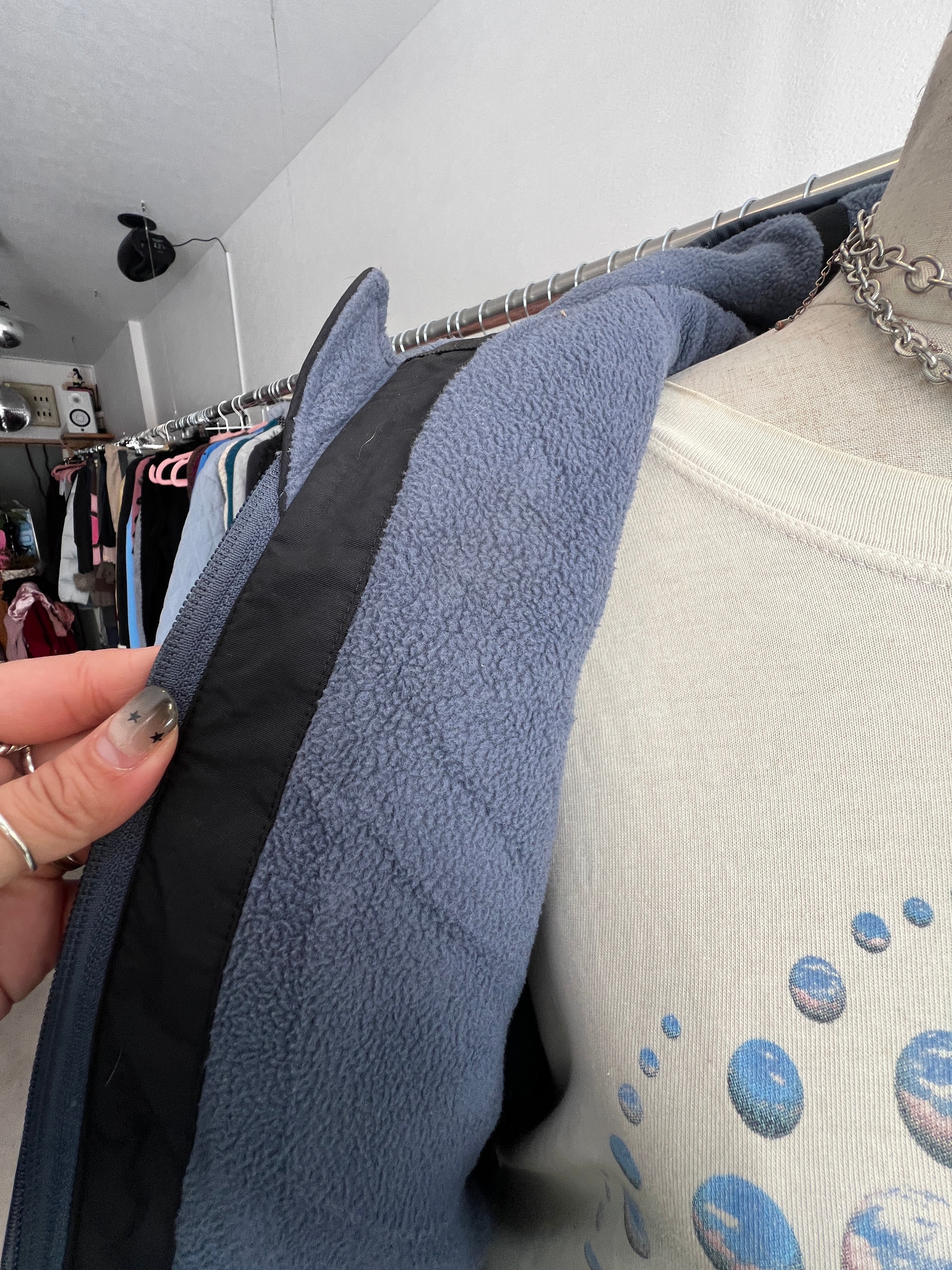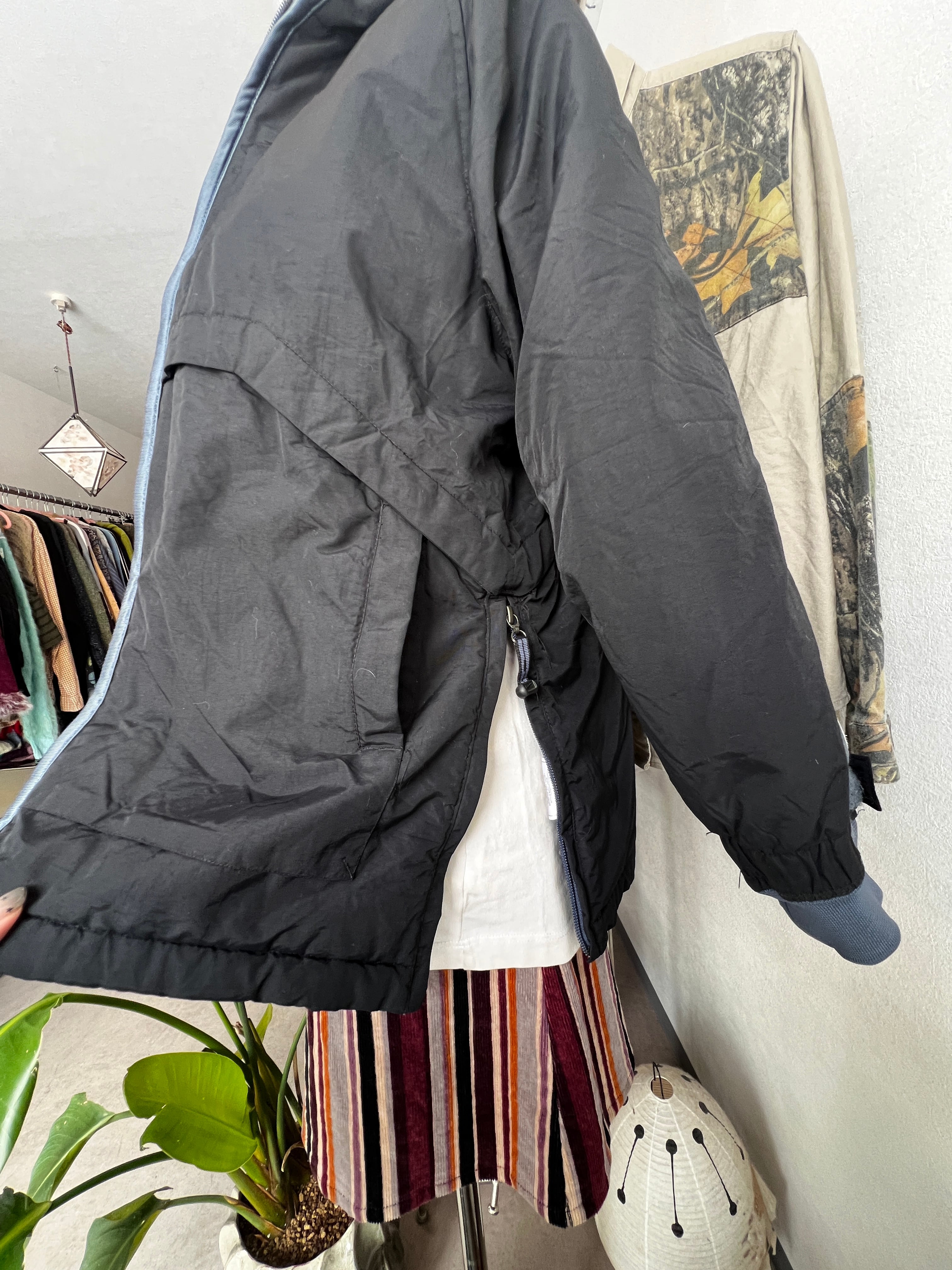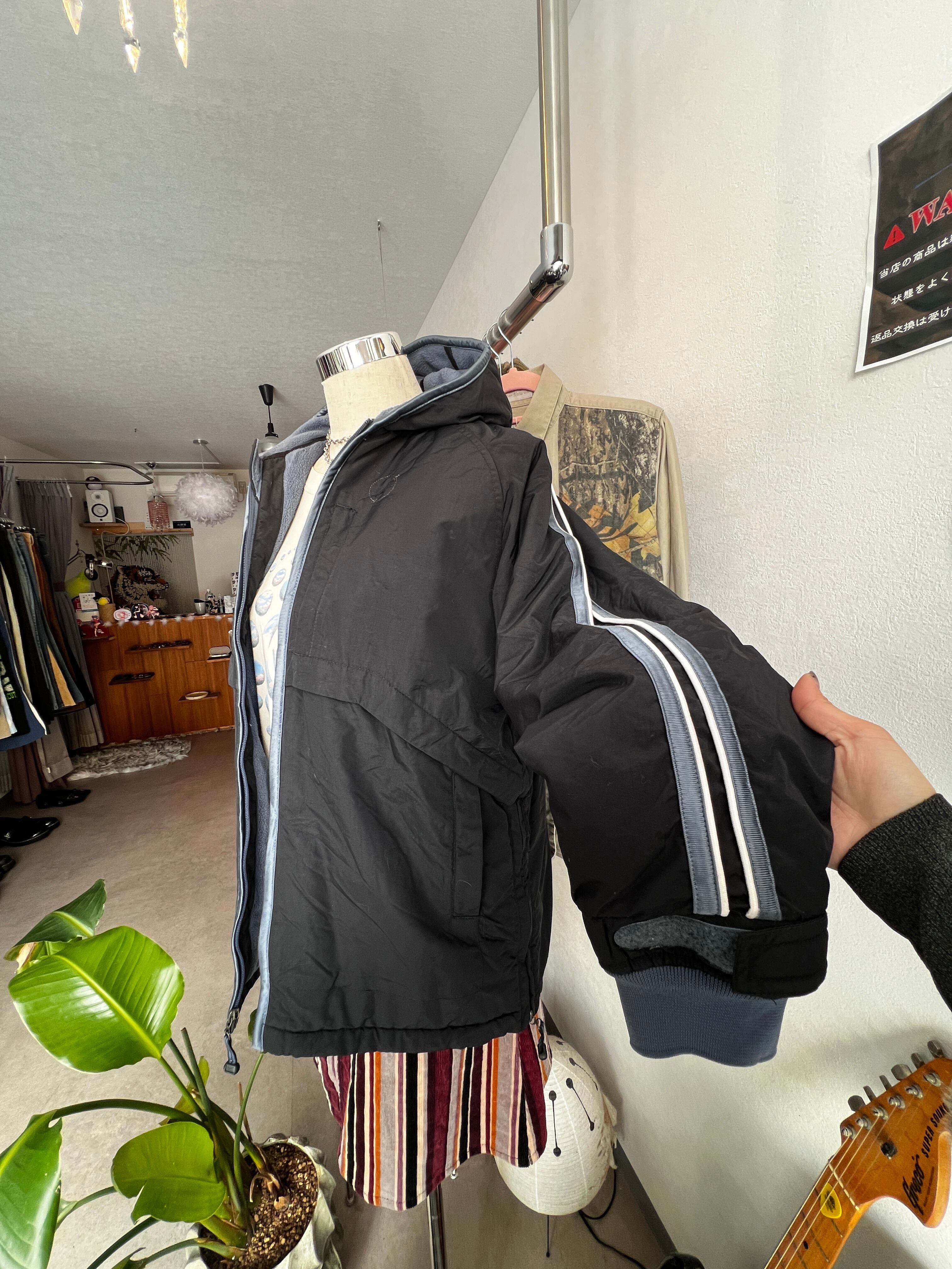 袖の太めライン、裏地のブルー、
